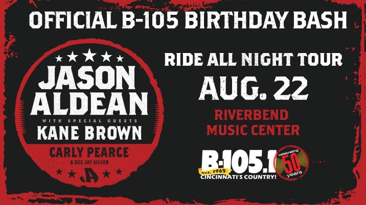 Jason Aldean announced on The Big Dave Show that his concert at Riverbend Music Center on Thursday, August 22 will be the official B-105 50th Birthday Bash. Along with Kane Brown and Dee Jay Silver on the bill, is Northern Kentucky native and Academy of Country Music (ACM) nominated, Carly Pearce. Carly grew up listening to B-105 and dreamed of one day being played on the station and performing on Riverbend’s stage. It’s two birthday wishes come true. Tickets go on sale Friday, April 5 at 10:00 a.m. through Riverbend.org.