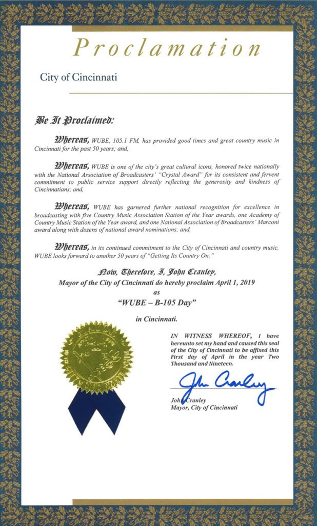 In addition to the City of Cincinnati’s Mayor, John Cranley proclaiming today as B-105 Day in Cincinnati, the station has also been honored many times in its existence. WUBE’s trophy case houses two Crystal Awards from the National Association of Broadcasters (NAB) recognizing its community service efforts; five Country Music Association (CMA) Station of the Year awards; one ACM Station of the Year award; and one NAB Marconi award for Country Station of the Year. WUBE DJs through the years have been feted with four CMA Personality of the Year awards and four ACM Personality of the Year awards. In all, WUBE or its on-air hosts have been nominated nationally over 40 times.